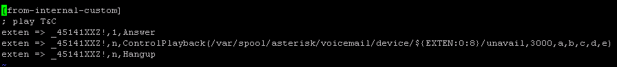 - 45141 is the extension prefix for T&C player, create each of your T&C extension in Asterisk and upload your voice file to the default voicemail location. My Asterisk T&C extension is 8 digits length, so you see the ${EXTEN:0:8} in the dialplan.