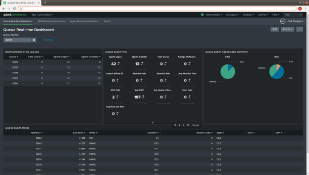 Lastly add your splitskillstatus, agentsnapshot and vdnsnapshot, qacdsplits, qtrunkgroup reports into CallAnalytics, you will find the following dashboards in Splunk. Enjoy!
