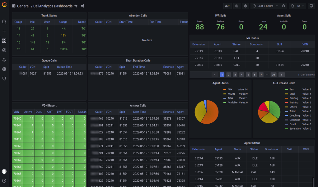 CallAnalytics can integrate with Grafana now! We can produce useful dashobards for Avaya call center by the integration. Traditionally, you cannot see which customer is waiting in queue, which one is abandoned and which one is disconnected right after an agent is connected using standard Avaya reports. Now you can see them in the Grafana. Here is the screen. You can contact service@upinget.com for more information.