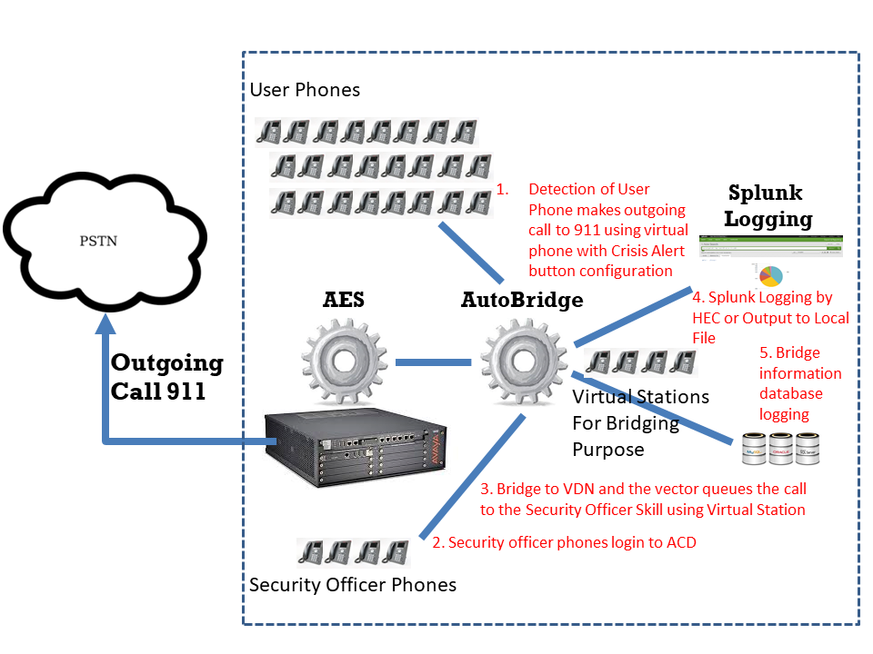 AutoBridge now supports bridging of 911 emergency calls with security officers immediately when user places a 911 call. The security officer can join the call or dispatch a team to assist the user if needed. AutoBridge uses DMCC to monitor a virtual station configured with Crisis Alert button. When user dials 911, the extension which dial the call is reported via the Crisis Alert button and the bridging process can be triggered automatically by the AutoBridge program. The AutoBridge can also use OSSI interface to get the caller who makes emergency call and trigger the process automatically.